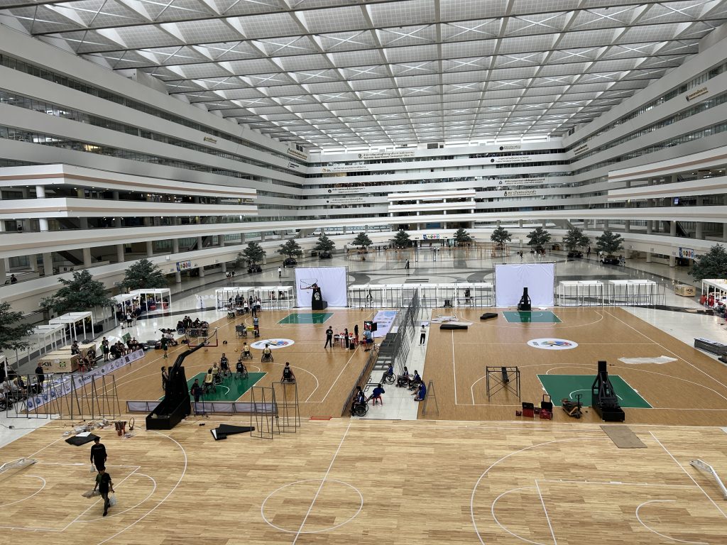 今大会は国際展示場のような建物の展示エリアにて試合が開かれていました。だだっ広いエリアにコートが設営されているこの環境は新鮮と言いますか、おもしろかったです。(笑)